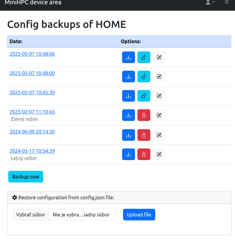 Prvé, čo je potrebné urobiť, je nastaviť si MiniHPC napr. na zimný režim, po konfigurácii je nastavenie MiniHPC uložené medzi zálohy v sekcii Backup/restore. Túto zálohu je potrebné uzamknúť, aby ju systém po 5tich dňoch automaticky nezmazal. Zamknuté zálohy nie sú premazávané. Následne je možné túto zálohu pomenovať, aby ju bolo možné neskôr jednoduchšie identifikovať v zozname záloh.