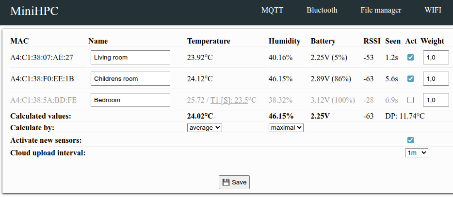 In this section of the MiniHPC configuration, it is possible to enable/disable individual sensors, change the name and assign them weight values for the average calculation. For example, for a temperature sensor located in a larger room, you can assign a higher weight, so its reading will have greater influence on the average. If a sensor is disabled, its value will still be displayed in the table but will not be included in the calculation.